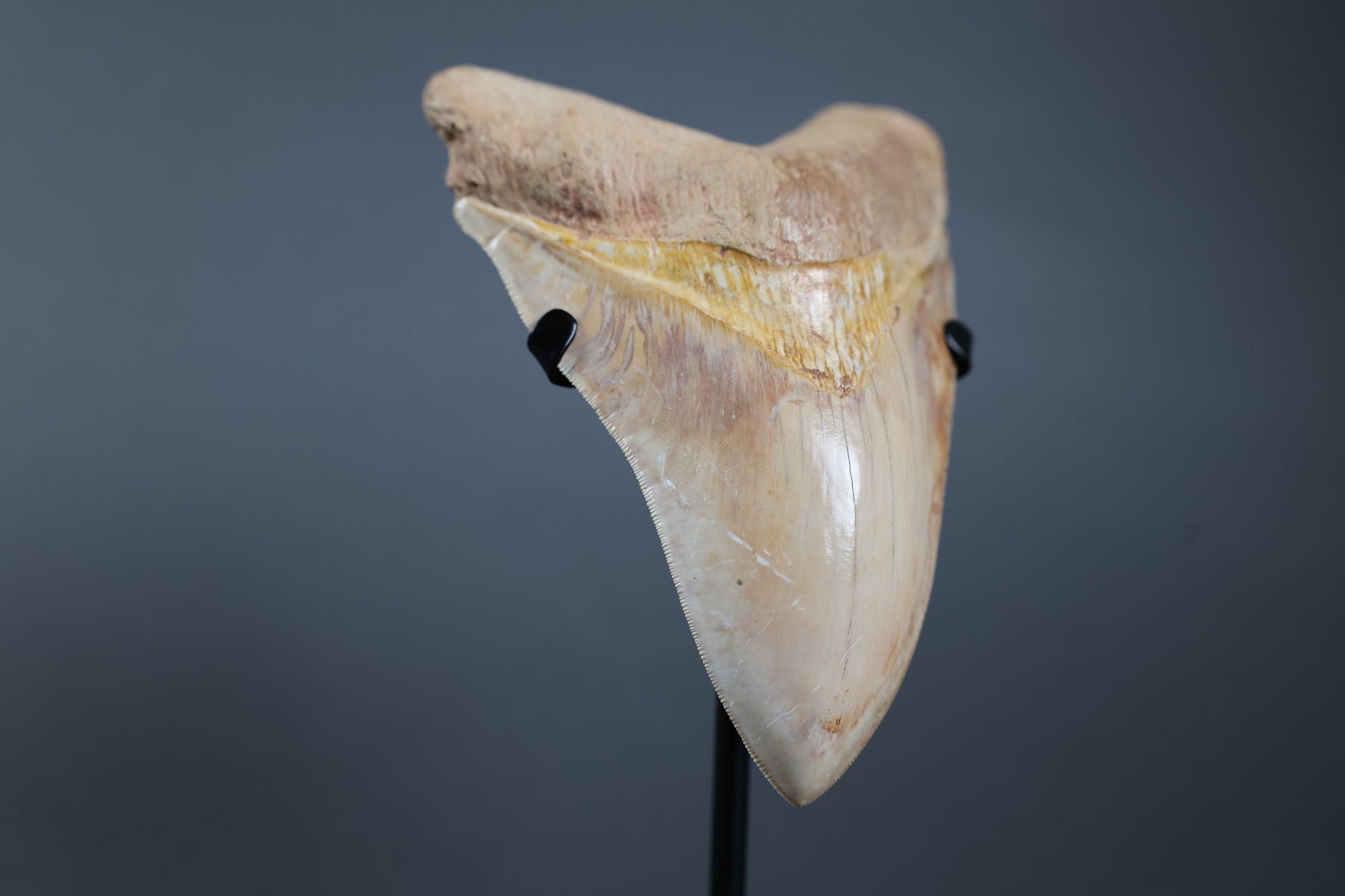 A superb megalodon tooth distinguished by its radiant golden bourlette and luminous, glassy enamel. Subtle beige and opaline tones transition toward red ochre and honey hues along the margins, the colours merging with remarkable harmony. Across the bourlette, a band of rich gold glows softly against the cooler enamel — a palette of rare sophistication.