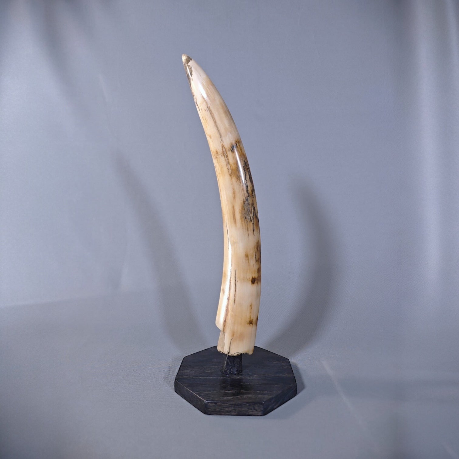 A custom-made stained solid oak stand showcases this Ice Age treasure’s beautiful curvature.
