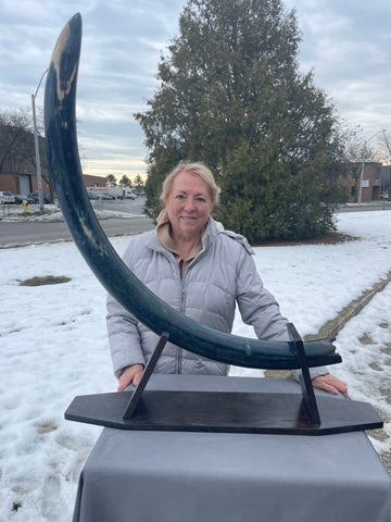 A custom-made stained solid oak stand showcases this Ice Age treasure’s beautiful curvature.