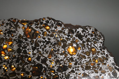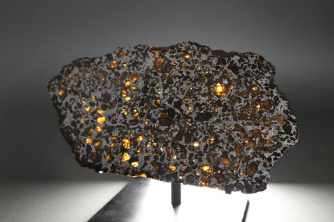 Stunning pallasite meteorite slice, Seymchan, 541.6 grams. This complete slice has the perfect ratio of olivine crystals to iron-nickel matrix. A rare and beautiful collector's piece - it has a unique, dramatic shape with a metallic "tail"!